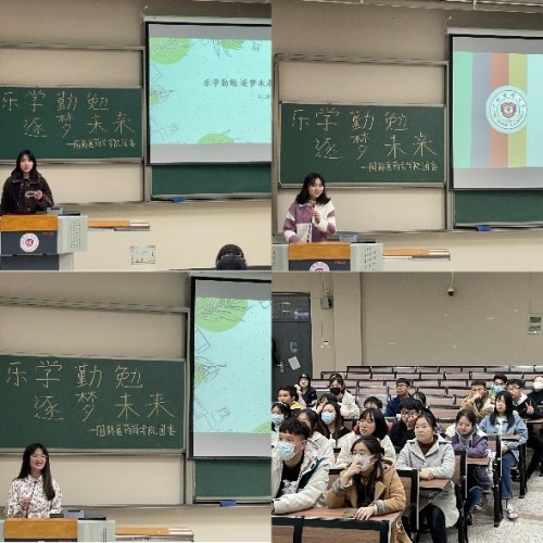 言华玲同学结合自身学习生活经验,从学习方法、课外活动、工作风采三个方面展开详细分享,她认为大学是一个从适应到成长的过程,鼓励同学们要走出舒适圈,勇于尝试、敢于付出,才能有所锻炼、有所收获;杨伊凡同学以自身经验为例,对同学们提出3点建议:第一,把握“主旋律”和“第二课堂”,紧跟课堂主动学习,参加各类比赛、志愿服务等活动,丰富阅历拓展思维;第二,敢于“撞南墙”,敢想、敢做、敢于试错,不强求结果,过程当中的收获更为重要;第三,关注“软实力”,提升语言表达能力,培养自信,并要定期进行自我评估,步履不辍,奋力向前。